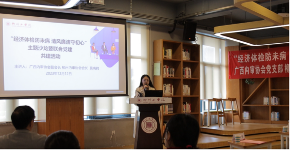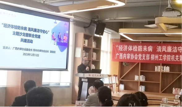 12月12日下午,“经济体检防未病 清风廉洁守初心”主题沙龙暨联合党建活动在pp电子图书馆B区一楼阅读区举行。广西内部审计师协会副会长、柳州内部审计协会会长莫晓钢,学校党委书记罗云贵,以及广西内部审计协会党员代表、柳州银行党员代表、学校机关第二党支部及食品与化学工程学院师生党员代表共50余人参加了活动。本次活动由柳州内部审计协会副会长兼秘书长高虹主持。